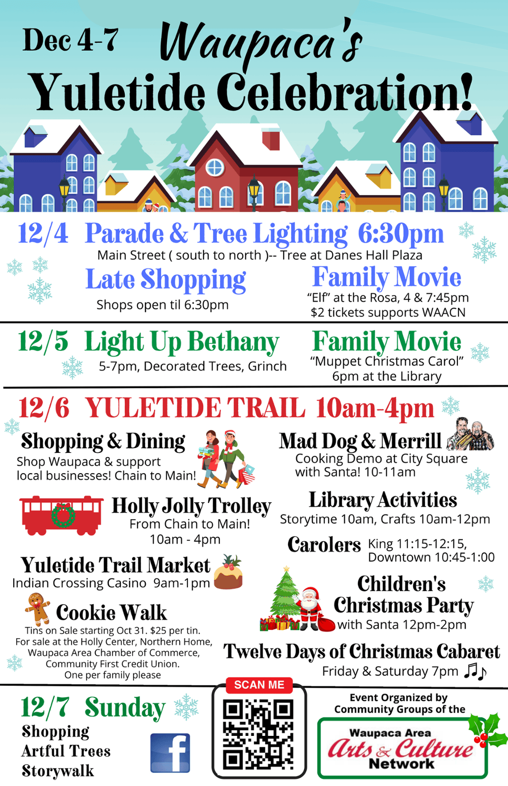 - ON SALE NOW: 2025 Yuletide Trail cookie tins ($25 each) on sale at the Holly Center, Community First Credit Union, Northern Home and Waupaca Area Chamber of Commerce